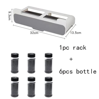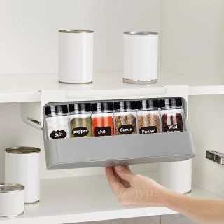 With cupboard space often at a premium, under-shelf spice organizer design makes use of unused space beneath the shelf. It features a clever, pull-out compartment that holds up to seven standard spice jars (not included).